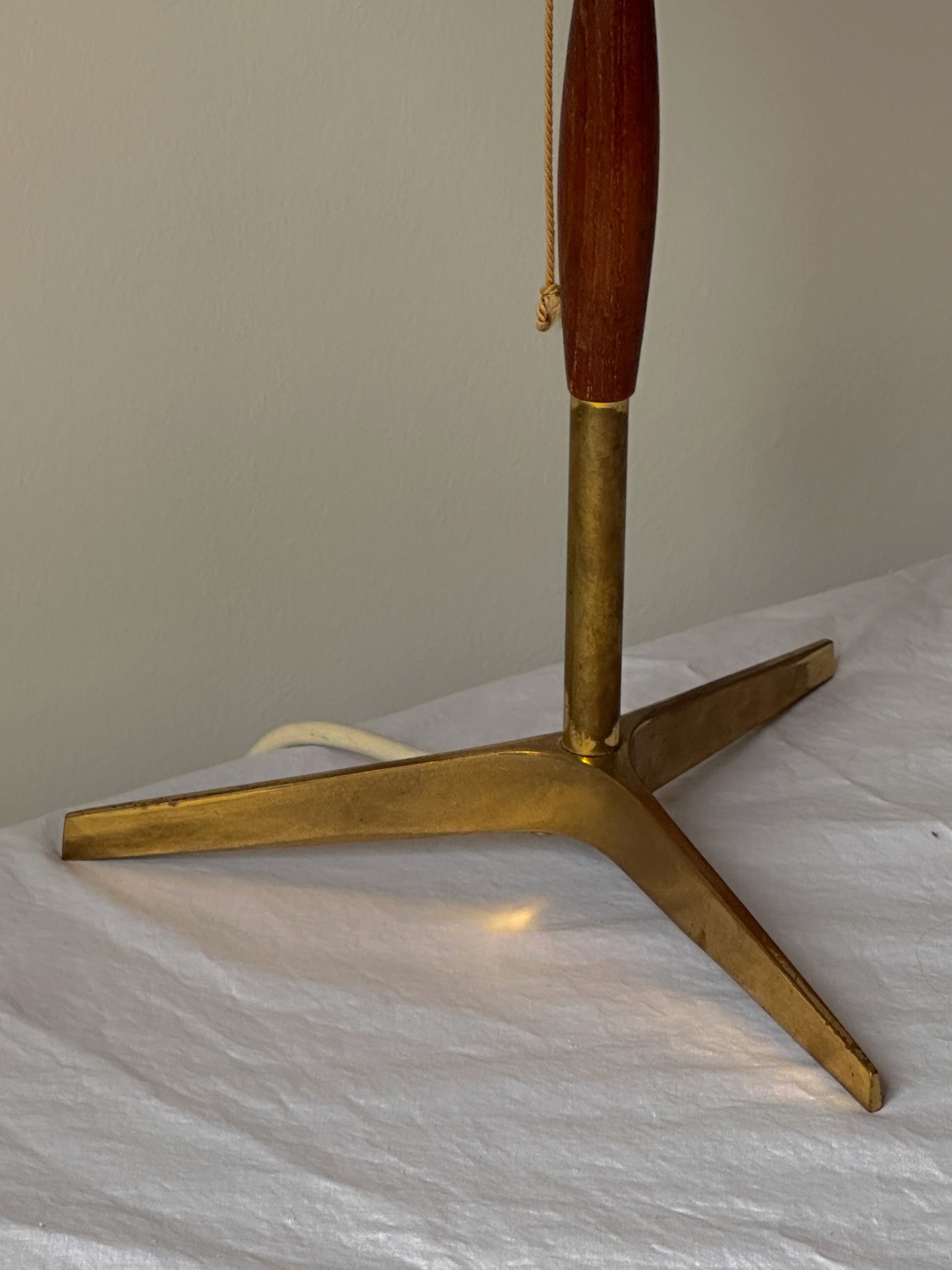This rare tripod-footed lamp features an orb-shaped shade made from soft, natural resin in a beautiful vintage cream color, emitting a softly textured glow. The resin seamlessly covers the metal structure, creating a smooth, sensual form - typically attributed to Castiglioni's 1960's cocoon lamps. With solid brass feet, a teak stem and cotton cord switch mechanism, the lamp is a beautiful combination of timeless shapes and materials.