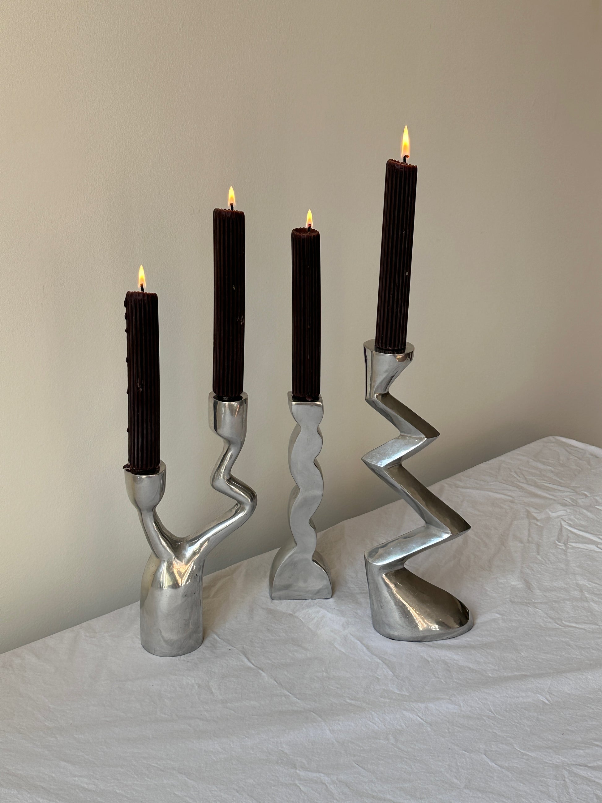 Trio of modernist style candle holders designed by Matthew Hilton. Produced in the 1980s. Made from cast aluminium.
