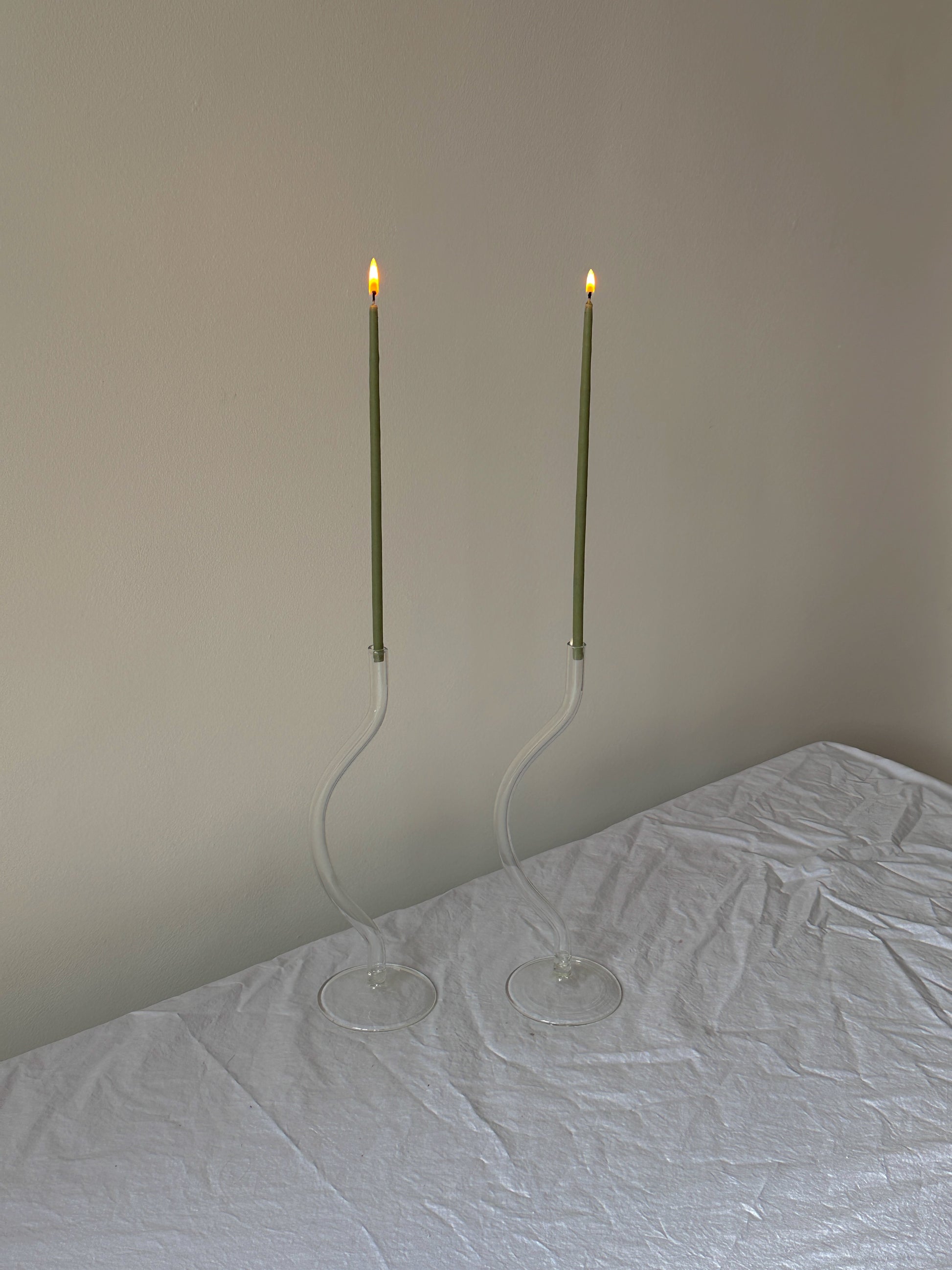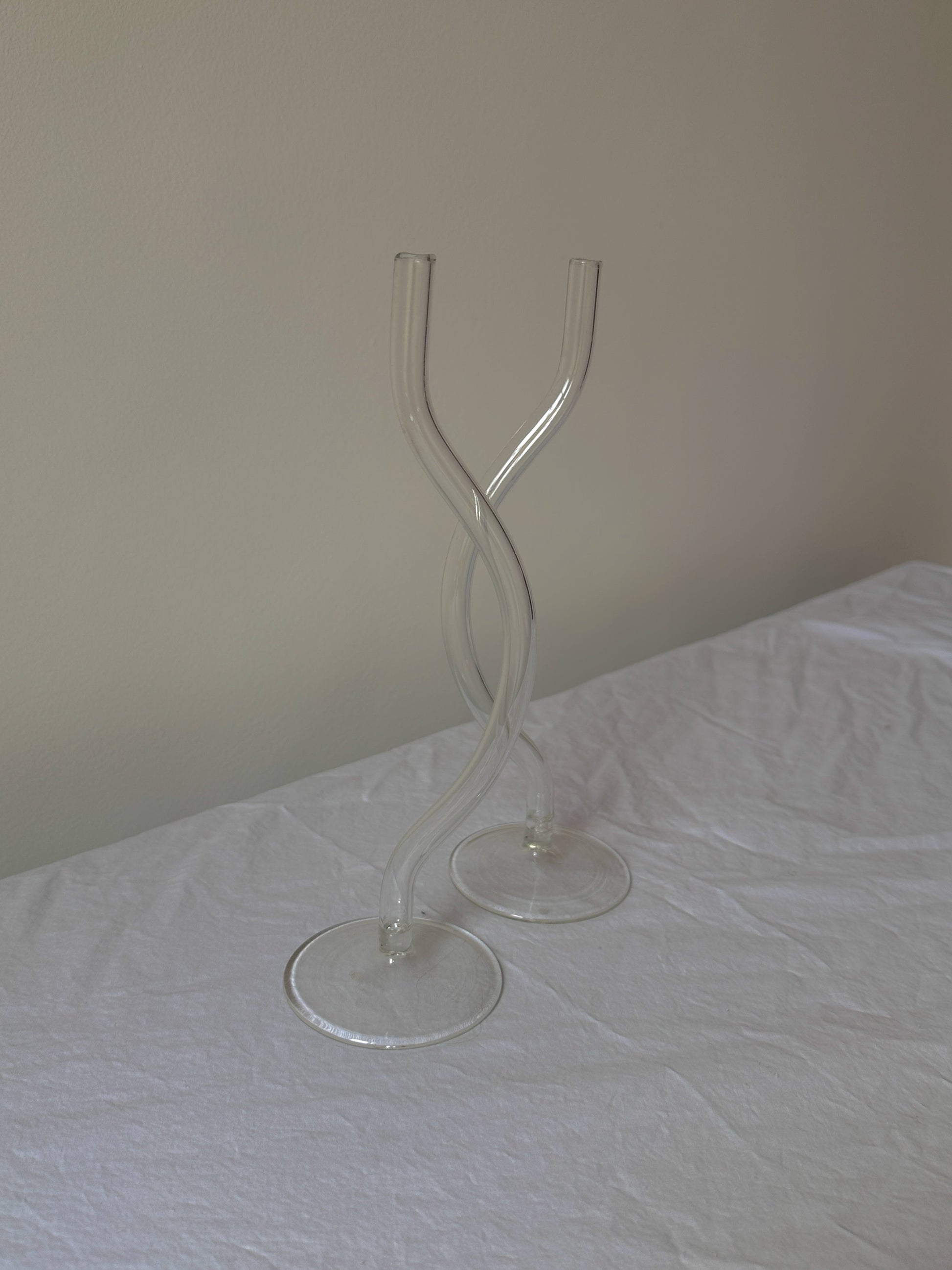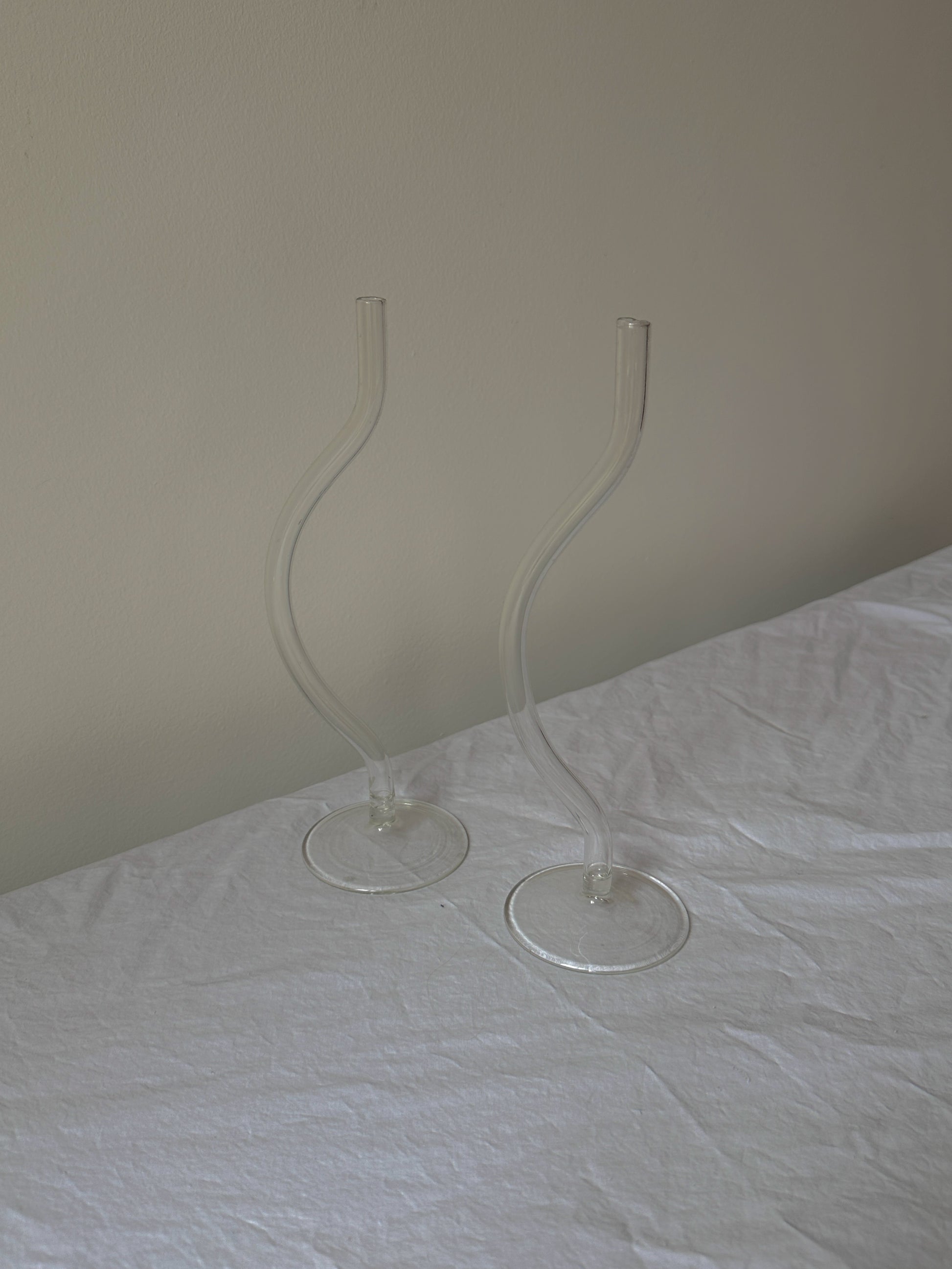 Matching pair of delicate hand-blown stem vases. Can also be used as candle holders.